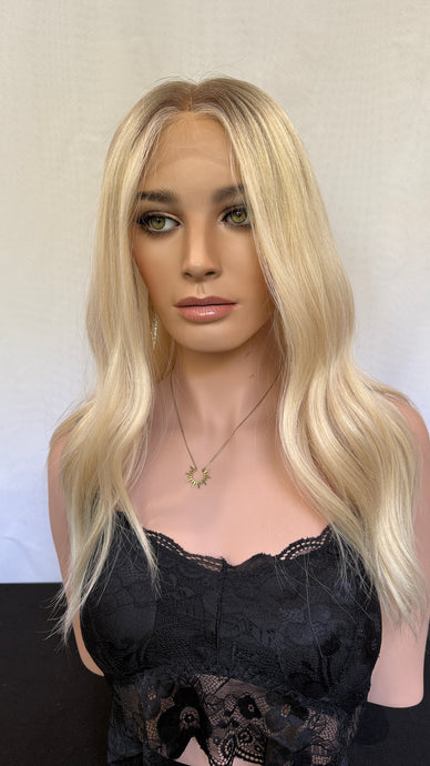 Bridget is a 10X11 whopper style topper, 20 inch length with face frame made with premium euro quality human hair