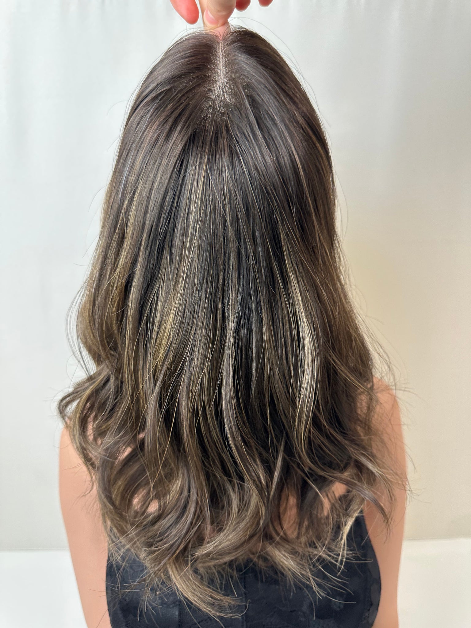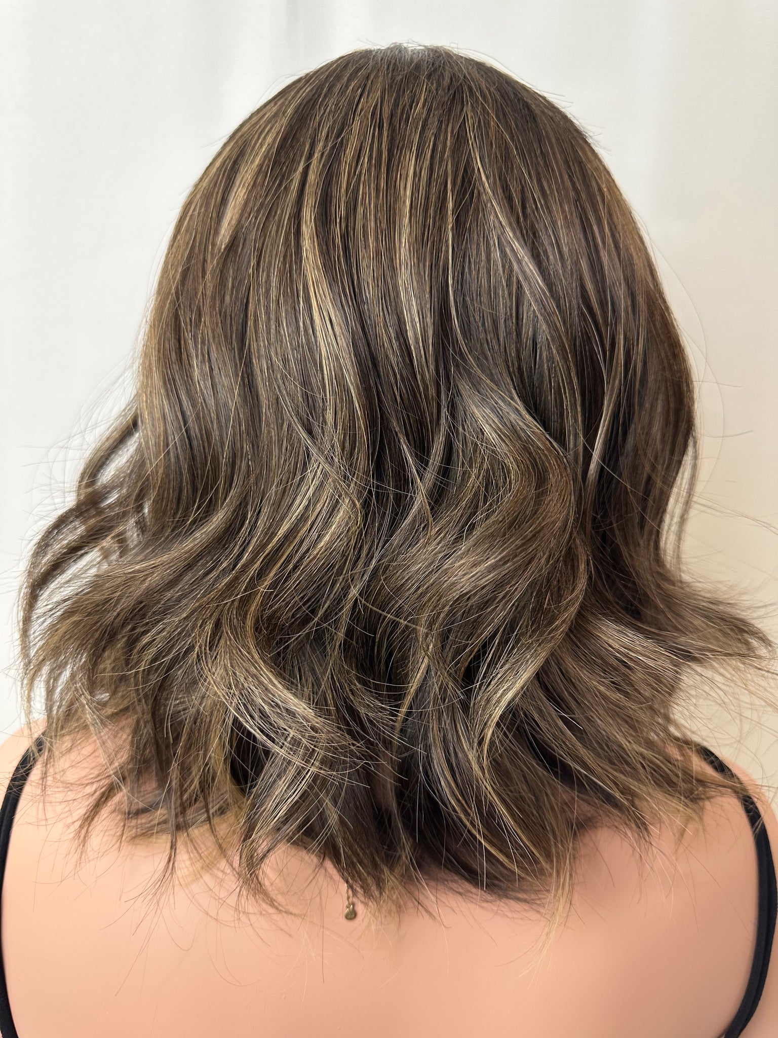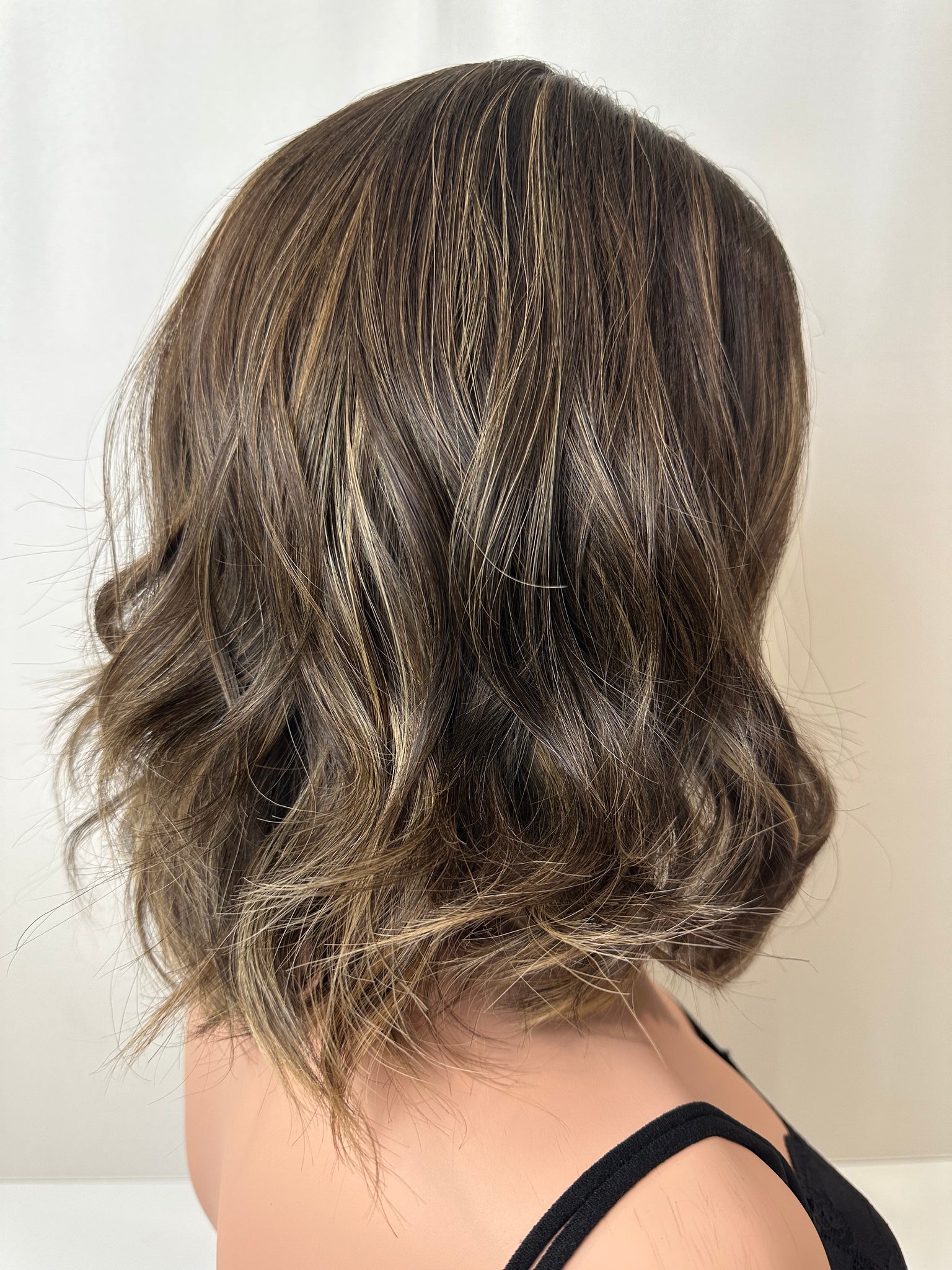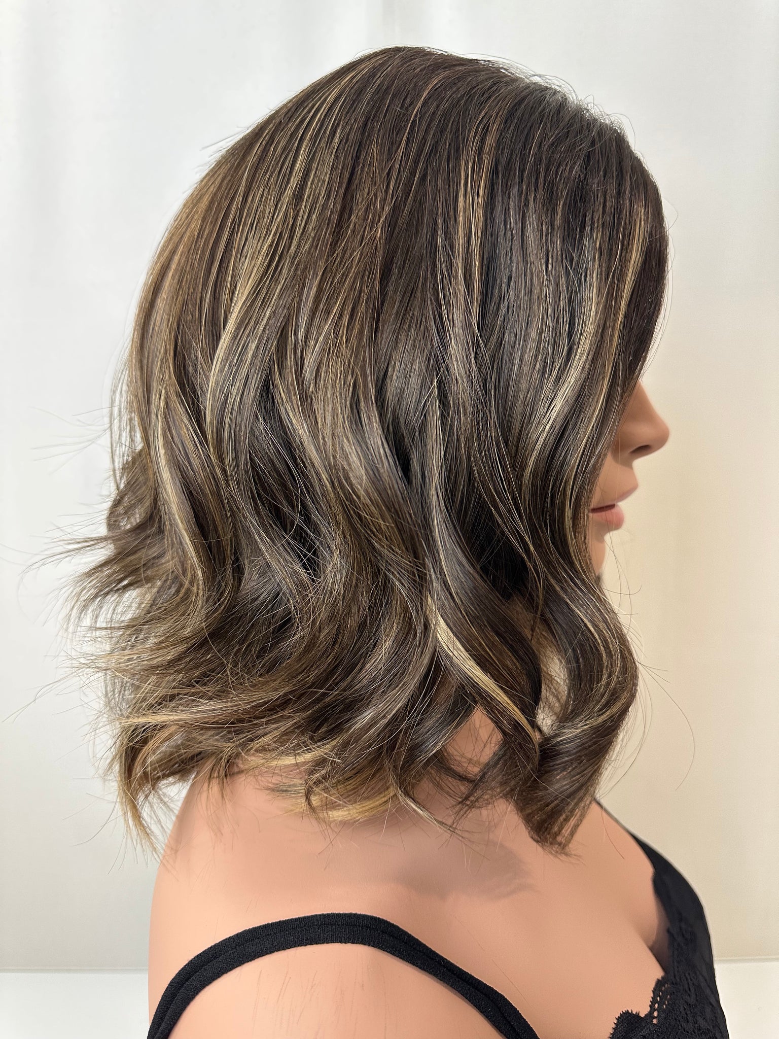 Caroline is a neutral brunette with feathered blonde highlights throughout